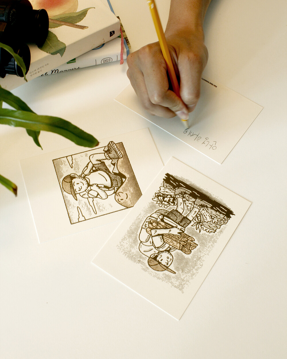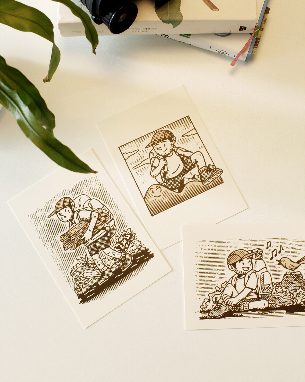 엽서 3종이 한 세트 구성으로 트레이싱지 봉투에 담겨 배송됩니다.